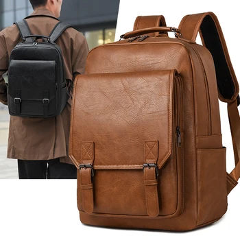 Men's Trendy Retro Business Computer Backpack Large Capacity Waterproof PU Leather Polyester Lining Zipper Closure for Travel